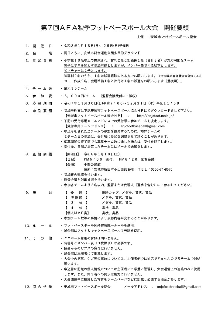 第7回 AFA秋季フットベースボール大会 開催要領(PDF)